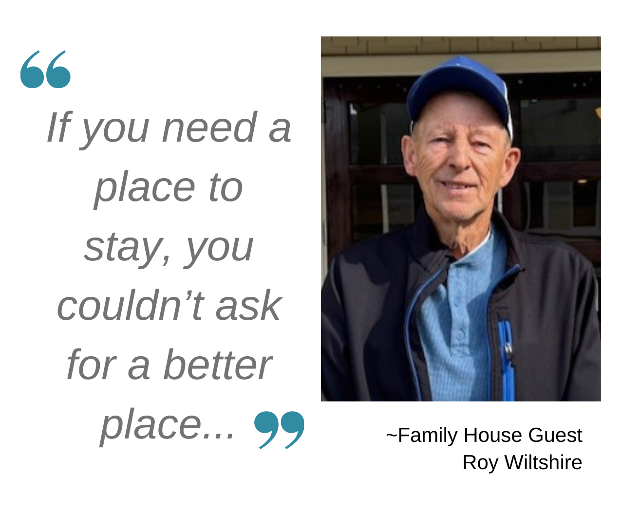When we first met Roy, without being asked, he wanted us to know what staying at Family House meant to him. “If you need a place to stay, you couldn’t ask for a better place to stay. The volunteers are fantastic. The staff is very helpful. I can’t thank everyone enough. Having cancer puts life in perspective. I’m thankful that I’ve also had five (more) years with my grandkids and wife. I keep my head up, and I’ve made my peace.”