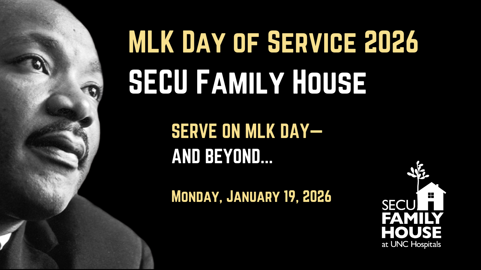 One way to get involved in the MLK Day of Service is by participating in projects organized by the SECU Family House to benefit UNC patients and their loved ones who travel on January 19th and beyond. SECU Family House works to provide a safe, nurturing, affordable home for patients and their loved ones who travel great distances to UNC Hospitals for life-saving procedures and serious illnesses.